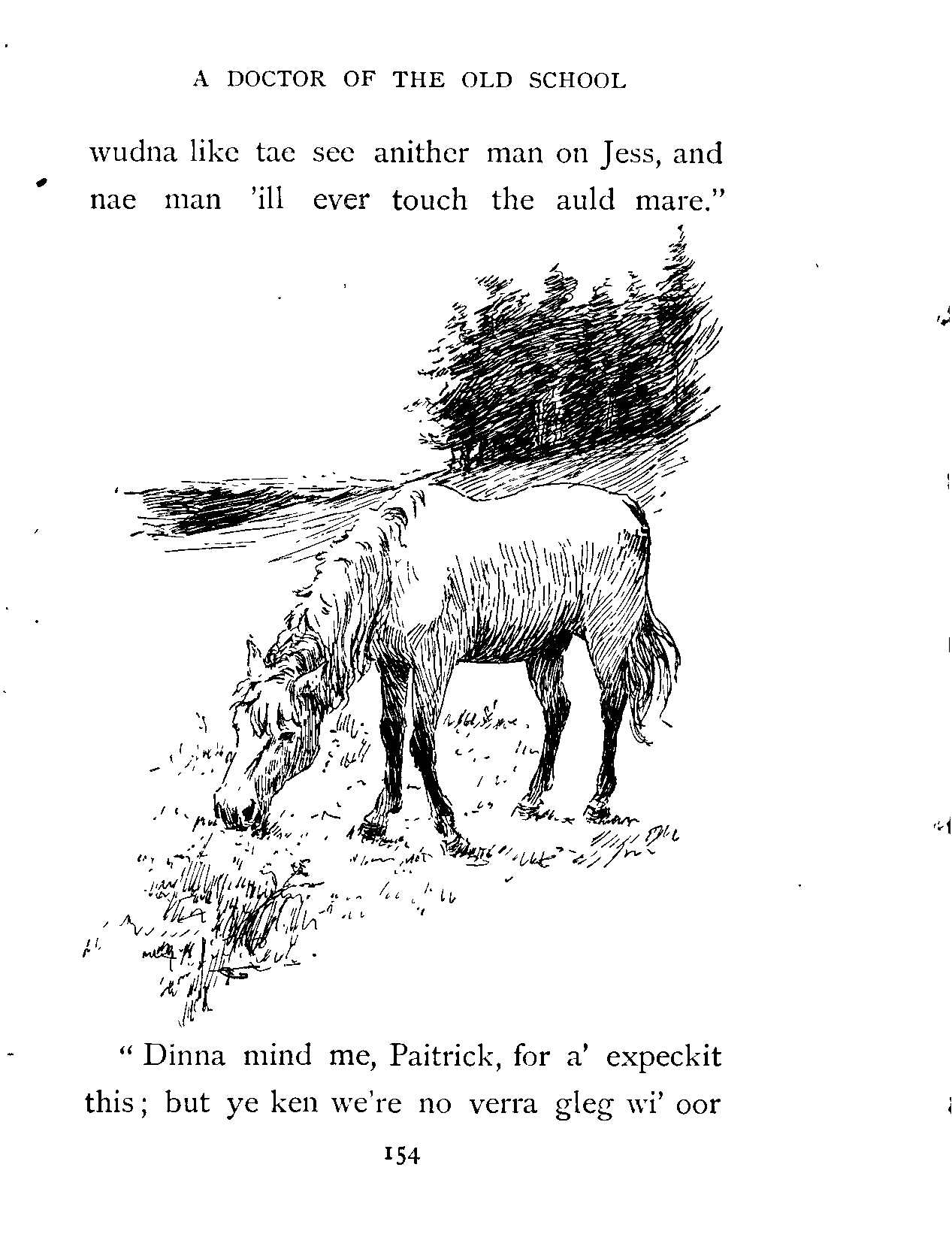 "Confoond ye, Weelum," broke out Drumsheugh; "its doonricht cruel o' ye to speak like this tae me. Whar wud Jess gang but tae Drumsheugh? she 'ill hae her run o' heck an' manger sae lang as she lives; the Glen wudna like tae see anither man on Jess, and nae man 'ill ever touch the auld mare."