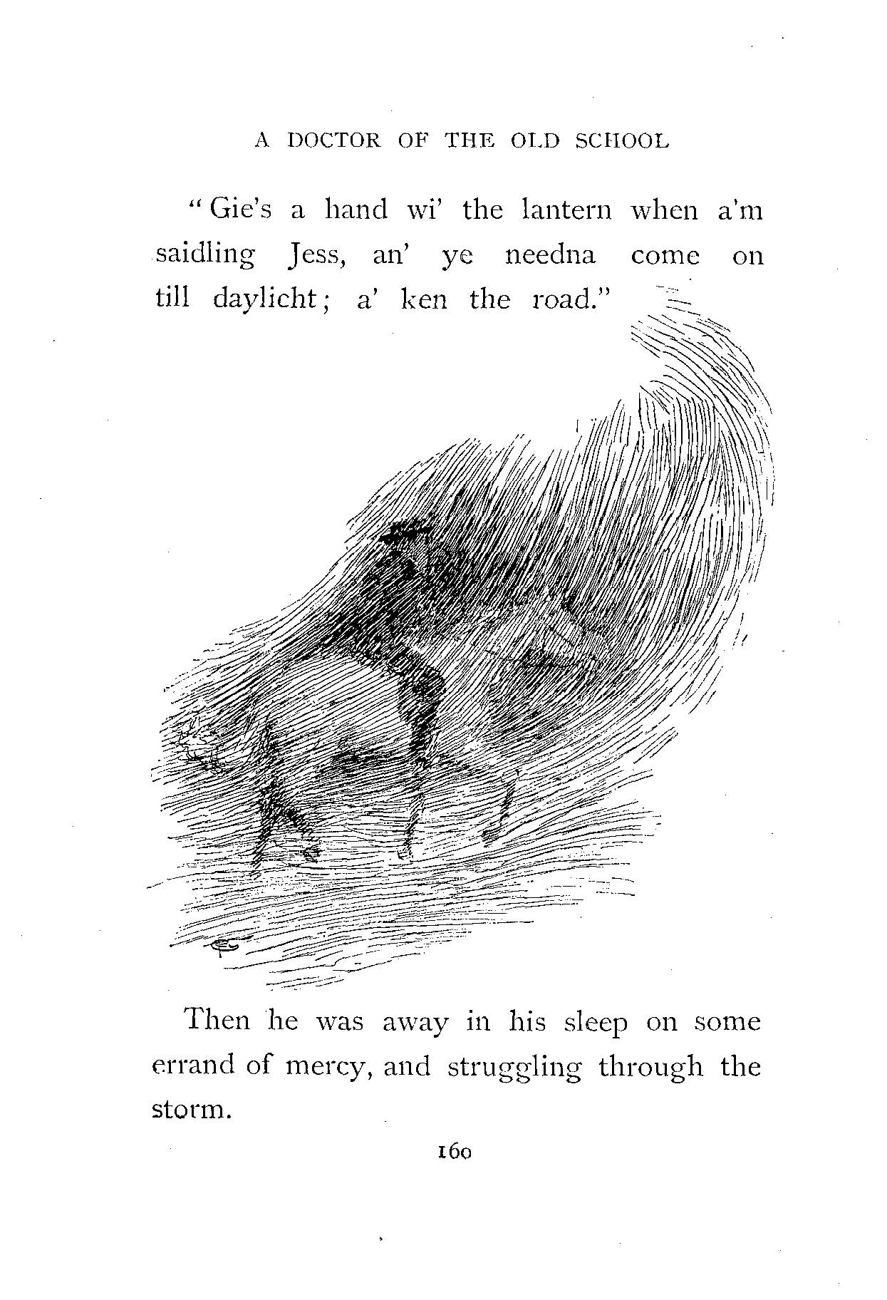 Then he was away in his sleep on some errand of mercy, and struggling through the storm. "It's a coorse nicht, Jess, an' heavy traivellin'; can ye see afore ye, lass? for a'm clean confused wi' the snaw; bide a wee till a' find the diveesion o' the roads; it's aboot here back or forrit.